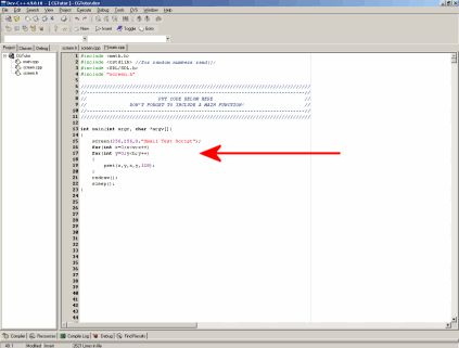 If you use the SDL 1.2 codebase (QuickCG) provided with the tutorial, unzip it to your code folder (that folder where you store all your DevC++ projects and code in, which is hopefully not in the unreliable My Documents folder of Windows), and just open its *.dev file with Dev-C++, and it should compile and run correctly. To compile it, use "Execute -> Compile" from the menu. The exe file will appear in the same folder as where your code is located. You can run it with "Execute -> Run". You can also compile&run your projects by pressing F9. If it doesn't work, look a bit further for a list of possible solutions. It's highly recommended that you use QuickCG for this tutorial, because the rest of the tutorial focuses on the commands of it and not on the actual SDL itself.